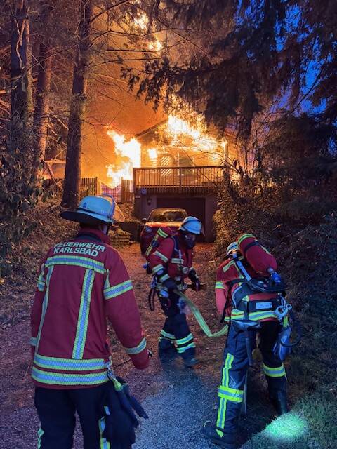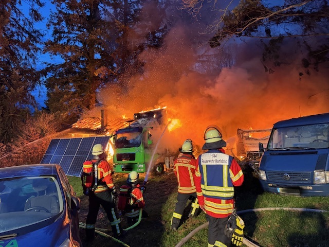 Am frühen Samstagabend wurde die Feuerwehr Karlsbad kurz vor 18 Uhr zu einem Gebäudebrand in den Allmendweg im Ortsteil Auerbach alarmiert. Bereits beim Eintreffen der ersten Einsatzkräfte stand das betroffene Gebäude in Vollbrand. Das Feuer hatte zu diesem Zeitpunkt bereits auf einen Wohnanhänger sowie einen Lastkraftwagen übergegriffen.
