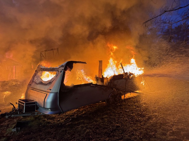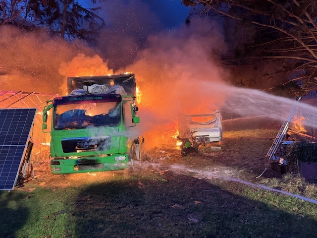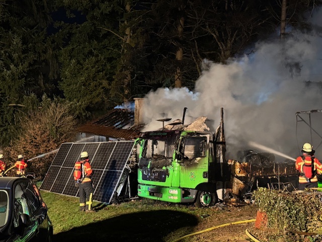 Trotz des schnellen Eingreifens konnten das Gebäude, ein gut ausgebaute Gartenhütte, sowie der Wohnanhänger und der Lastkraftwagen nicht mehr gerettet werden und wurden durch das Feuer vollständig zerstört.