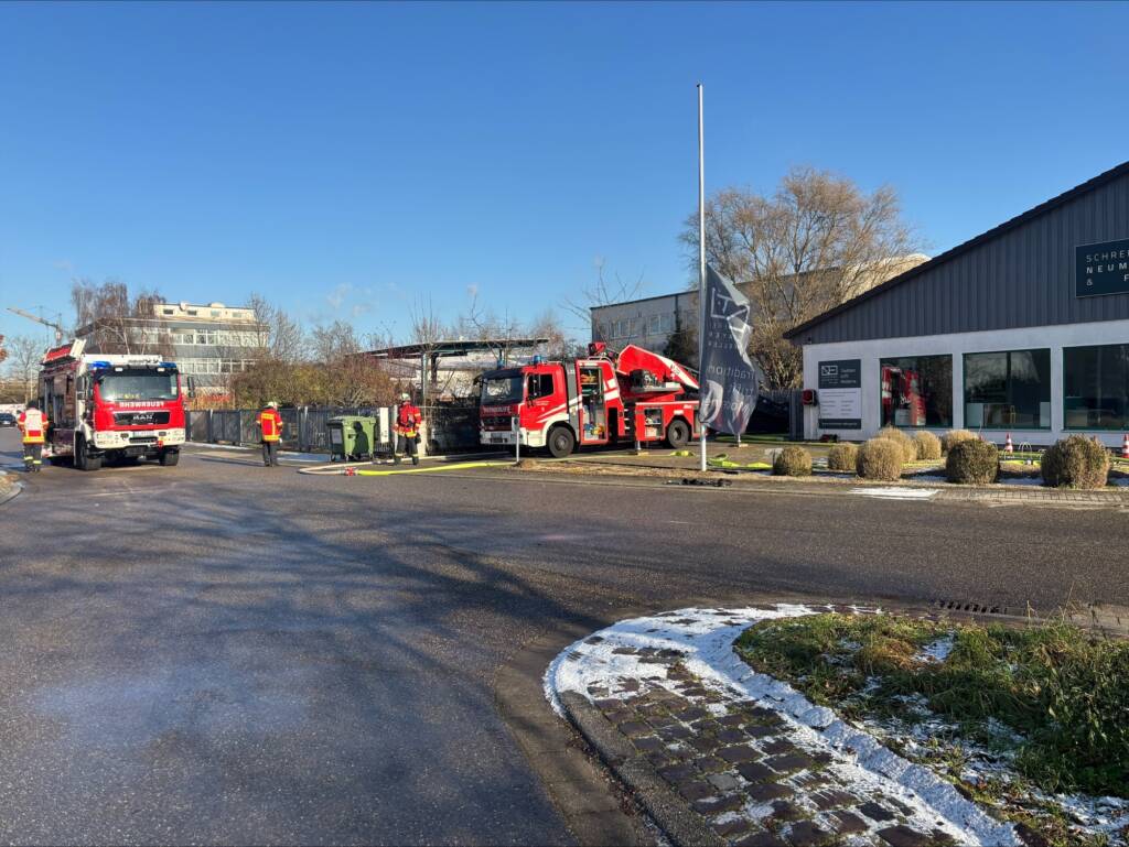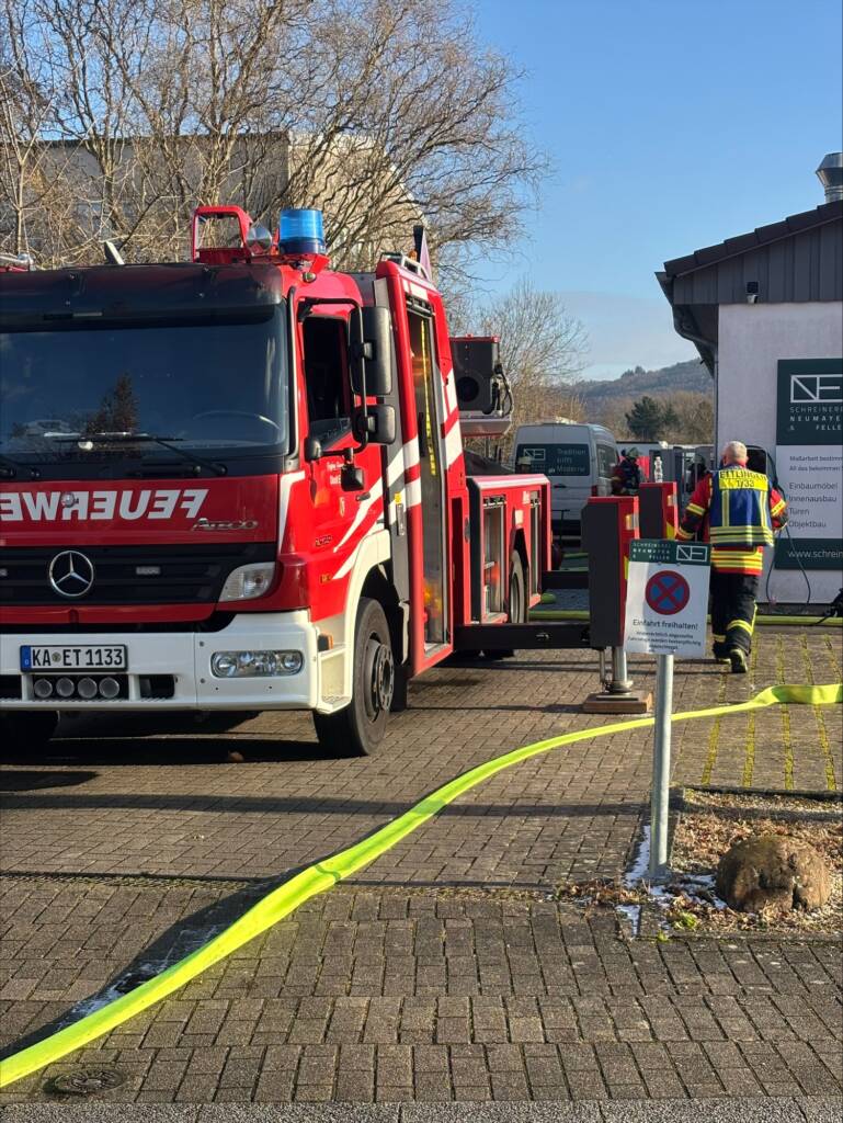 Am heutigen Dienstag wurde die Freiwillige Feuerwehr Ettlingen um 11:30 Uhr zu einem Brand in einer Schreinerei in der Otto-Lilienthal-Straße alarmiert. „Als wir angekommen sind, quoll bereits dichter Rauch aus dem Dachbereich“ berichtete Alexander Johmann, Einsatzleiter der Feuerwehr Ettlingen. „Wir konnten von außen jedoch nichts machen und mussten im Innenangriff die Brandbekämpfung vornehmen. Der Zugang zum Dachboden war jedoch nur durch eine Luge im Werkstättenbereich möglich.“ Berichtete er weiter. Bei der weiteren Erkundung wurde sodann festgestellt, dass es bereits zu einen Flammenaufschlag des Dachbodens gekommen sein. „Wir mussten diese Dämmung des Bodens entfernen, um weiteren Schaden abzuwehren“ so sein abschließendes Fazit“.